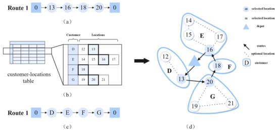 An example solution of the VRP-CS. (a) Route of service locations. (b) Part of customer–locations table. (c) Route of service customers. (d) Distribution route.