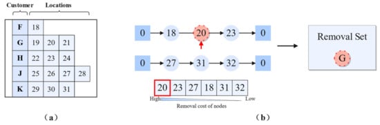 Illustration of removal operators. (a) Example customer–locations table mapping customers (F–K) to potential delivery locations (18–31). (b) Schematic representation of routes where removal occurred (top panel shows two routes, with delivery locations 18, 20, 23, 27, 31, 32), delivery locations to be removed (e.g., delivery location 20), and node removal costing diagram (bottom panel), where selected customers (e.g., delivery option 20, which belongs to customer G) are moved to the “request bank” (list of removed customers).