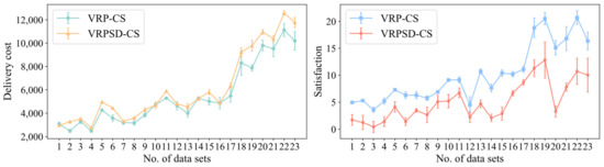 Early studies mainly associated customer satisfaction with delivery punctuality. Fan [16] considers customer satisfaction in a VRP with simultaneous pickup and delivery; they argue that customer satisfaction is inversely proportional to the amount of time the customer waits for the vehicle, that each delivery has to be met as early as possible, and that their problem aims to improve total customer satisfaction. Qin et al. [17] use delivery punctuality as an evaluation criterion for customer satisfaction: when the delivery occurs within the time window, the customer feels fully satisfied; otherwise, the customer will feel dissatisfied. In their study, they use average satisfaction as the target, which effectively improves the average customer satisfaction by a small increase in the cost.