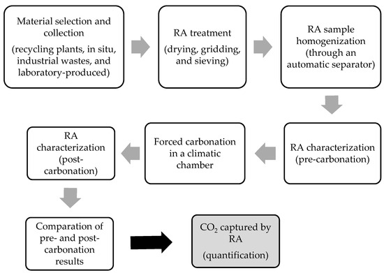 The first step consisted of the selection and collection of RAs, which were then dried at 60 °C until constant mass was reached. Next, the RAs were ground and sieved according to the European Standard EN 1015-1 [25], and only particles under 2 mm were subjected to forced carbonation. The RAs will be used in mortars in future applications. The samples were prepared with the same particle size distribution in order to obtain different aggregates with the same granulometric distribution, eliminating the granulometry factor [14]. Then, the samples went through an automatic separator for better homogenization, obtaining a representative sample for each period of carbonation selected. Forced carbonation was carried out in an ARALAB Fitoclima 300 EP climatic chamber with different exposure times to a 99.7% pure CO2 flow, varying the temperature, RH, and CO2 concentration between 23 and 60 °C, 40 and 60%, and 10 and 25%, respectively. Figure 1 presents the workflow used in this study, adapted from Bastos et al. [14]. The temperature range studied extended from room temperature (23 °C) to 60 °C, as 60 °C is the highest temperature that can be used without degrading RA [26]. The RH range was selected as it is a well-defined parameter for carbonation reactions (around 60%). The RH levels of 40% and 50% were chosen to evaluate the effect of reduced water availability on carbonation efficiency. The CO2 concentration was initially studied at 25%, representing high-purity CO2 streams typically used in controlled carbonation experiments. Subsequently, it was reduced to 10% to reflect the variability in CO2 concentrations in industrial flue gases, which often range between 10% and 25%. All these conditions are guaranteed by sensors placed inside the carbonation chamber.