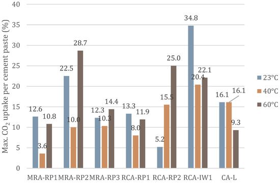 Maximum CO2 uptake content captured by each RA at 23 °C, 40 °C, and 60 °C, in relation to the respective cement paste content (relative humidity of 60% and 25% of CO2).
