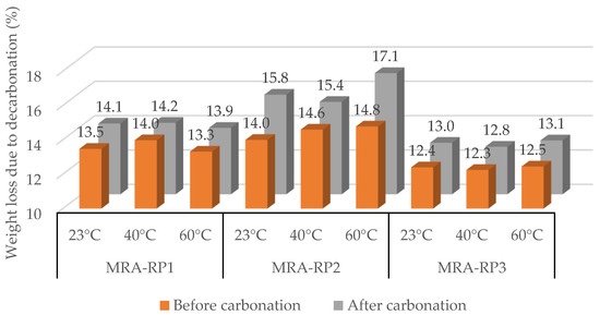Figure 3 shows the weight loss due to decarbonation (400–500 °C) before and after forced carbonation, considering the time at which maximum CO2 uptake was achieved. In general, it was concluded that the increase in temperature from 23 °C to 40 °C resulted in lower CO2 absorption by the mixed recycled aggregates. However, at 60 °C, two of the MRAs (MRA-RP2 and MRA-RP3) absorbed a quantity of CO2 higher than that recorded at 23 °C. For MRA-RP1, the maximum CO2 capture was 12.6%, 3.6%, and 10.8%, at 23 °C, 40 °C, and 60 °C, respectively. For MRA-RP2, the maximum was 22.5%, 10.0%, and 28.7%, respectively. Finally, for MRA-RP3, the maximum values of CO2 captured were 12.3%, 10.3%, and 14.4% at 23 °C, 40 °C, and 60 °C, respectively. For industrial implementation, it is important to check that CO2 capture remains viable at a temperature as high as 60 °C.