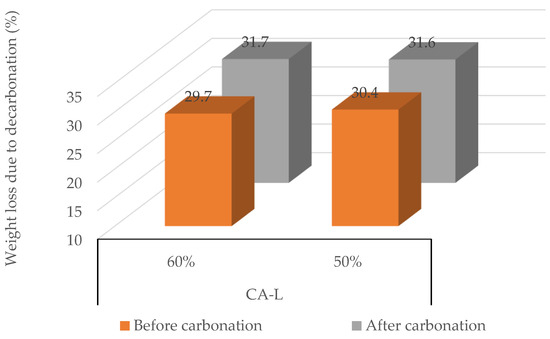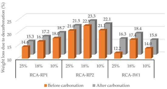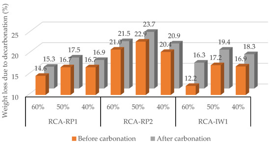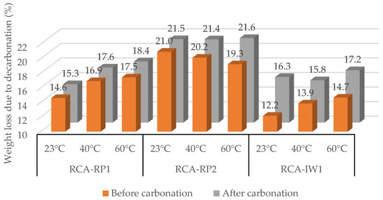 Figure 4 shows the weight loss of the RCAs due to decarbonation before and after forced carbonation at 23, 40, and 60 °C, considering the time at which the maximum CO2 uptake of RCA was reached.