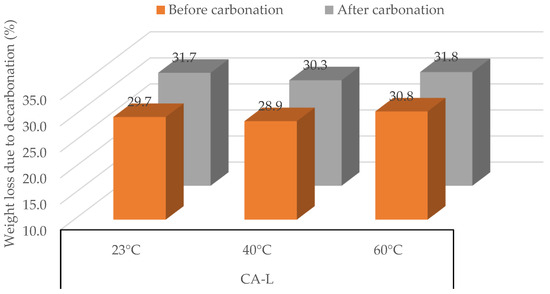 Weight loss due to decarbonation, before forced carbonation and after; the maximum CO2 uptake for CA-L was measured at temperatures of 23, 40, and 60 °C.