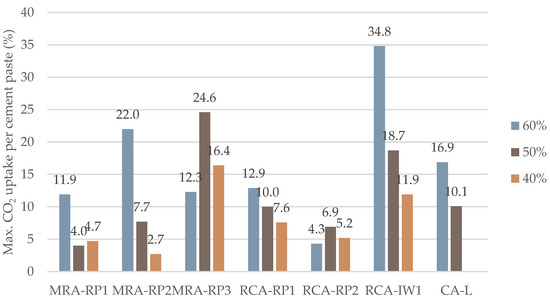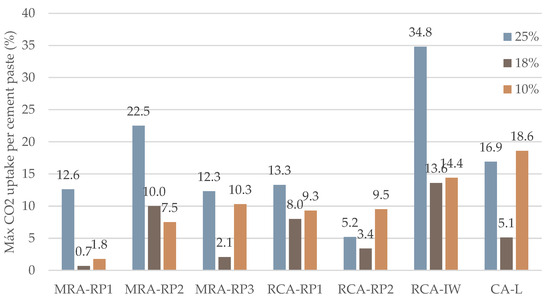 In general, the analysis of the results presented in Figure 6 confirm the previous conclusion that the reduction in CO2 concentration decreased the CO2 capture content per cement paste. The exception is RCA-RP2, where the maximum capture was obtained with 10% CO2 concentration.