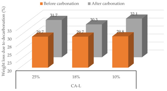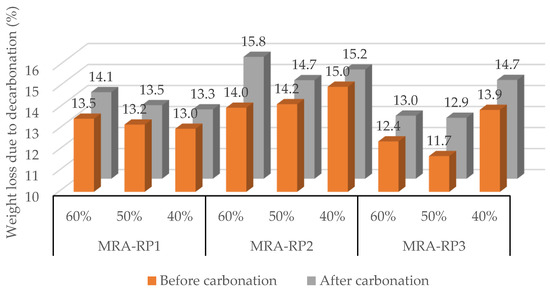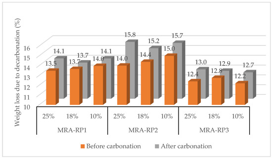 For MRA-RP1, the maximum amounts of CO2 captured per cement paste were 1.8% at 10% [CO2] and 12.6% at 25% [CO2]. Interestingly, in the tests at 18% [CO2], carbonation was very small (0.7%). For MRA-RP2, the maximum CO2 uptake values were 7.5%, 10.0%, and 22.5%, at 10%, 18%, and 25% [CO2], respectively. Lastly, for MRA-RP3, the maximum values of CO2 captured were 10.3%, 2.1%, and 12.3% at 10%, 18%, and 25%, respectively. Therefore, it is concluded that increasing the CO2 concentration from 10% to 25% promoted a higher CO2 capture by the mixed recycled aggregates. When the CO2 concentration is increased within the reaction environment, it stimulates the progression of the reaction, resulting in a more accelerated and thorough conversion of CO2 into carbonate compounds. In this sense, lower concentrations lead to longer periods of carbonation. These results are consistent with those of Xu et al. [7], who also found that increasing CO2 concentration led to an increase in the rate and degree of carbonation. Figure 7 presents the variation in weight loss from calcium carbonate decarbonation in the period of maximum CO2 capture, before and after forced carbonation, indicating an increase in CO2 in the aggregates.