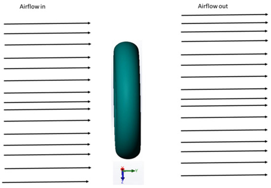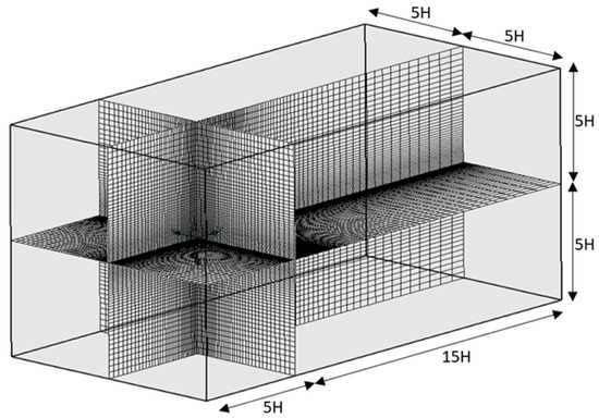 The computational domain defines the boundaries for CFD calculation. For external flow scenarios, the dimensions are dependent on fluid behaviour. The upstream region must enable a stabilised flow, while the downstream and side regions must accommodate flow deviations and wake formations. This study established a computational domain by adapting the “Silsoe Cube” simulation by Revuz, Hargreaves and Owen [7] (Figure 3). In this study, ‘H’ was amended to the outer diameter (Equation (1)), and the domain height ‘6H’ was replaced with 5H on both sides (Figure 3).