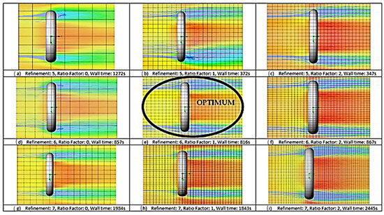 To enable accurate calculations, the computational domain was divided into a structured mesh consisting of rectangular parallelepipeds [8]. A mesh convergence analysis was then completed to find the optimum precision-to-wall time relationship [1,6,7,8,9,10,11,12] (Figure 4). In the case of this report, the global mesh was refined to increase discretisation (a refinement value of six was used on SWFS), whilst a ratio factor was introduced to improve precision and minimise the computational cost by refining the mesh in close proximity to the O-ring and coarsening it towards the periphery; a ratio factor of one was assigned using SWFS (Figure 5). As presented in Figure 4, the optimised mesh (refinement of 6 and a ratio factor of 1) combines quick processing with accurate flow trajectories, and no unnecessary eddies were generated in the wake region unlike trials (b) and (d), and a wall time of 816 s was significantly less than trials (g–i) (Figure 4).