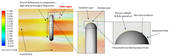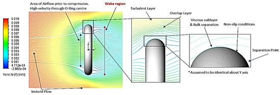 The first major finding is that fluid velocity equals zero at the surface boundary (Figure 6), proving the concept of non-slip conditions claimed by other authors [13,14,15]; as the flowlines then distance from the O-ring, frictional forces decrease, enabling fluid flow to return to maximum velocity [13]. This region of varying velocity is classified as the boundary layer and incorporates a viscous sublayer, buffer layer, overlap layer and turbulent layer. Within internal, turbulent flow scenarios, the proximity near the wall can be stratified into distinct sublayers: the viscous sublayer, directly adjacent to the no-slip boundary, where molecular viscosity dominates, resulting in a linear velocity profile and high viscous shear stress; the buffer layer, transitioning from the viscous sublayer, where turbulent kinetic energy increases, leading to instability and the onset of turbulent fluctuations; the overlap (log-law) layer, further from the wall, exhibiting a logarithmic velocity profile governed by the balance between diminishing viscous shear stress and increasingly dominant turbulent shear stress, as described by the logarithmic law of the wall; and the outer layer, where turbulent shear stress significantly outweighs viscous stress, resulting in an inviscid turbulent flow characterised by momentum transport driven by large-scale eddies and approaching the free-stream velocity, with accurate representation in this layer reliant on turbulent kinetic energy cascade and eddy viscosity models [15,16].