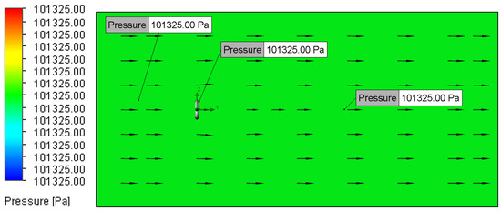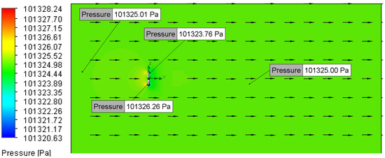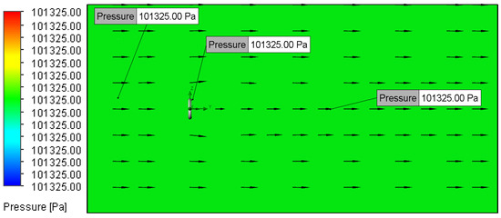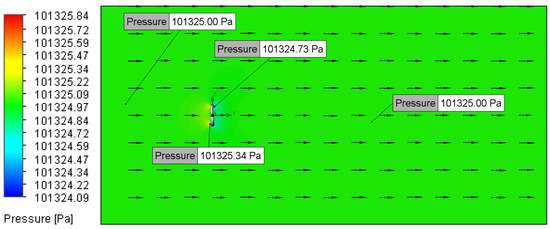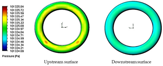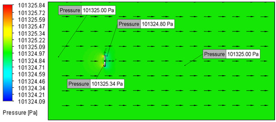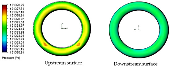 When simulating low-speed airflow (0.01 m/s and 0.02 m/s), the static pressure distribution stayed constant, approximating the ambient pressure of 101,325 Pa (Figure 13, Figure 14, Figure 15, Figure 16, Figure 17, Figure 18, Figure 19, Figure 20, Figure 21, Figure 22, Figure 23, Figure 24, Figure 25, Figure 26, Figure 27 and Figure 28). However, with increasing inlet velocities (1 m/s and 2 m/s), a distinct pressure gradient developed around the O-ring (Figure 11 and Figure 12). Upstream, a high-pressure region formed due to the fluid’s stagnation and the normal force exerted on the O-ring surface, particularly at the stagnation points. Conversely, downstream, the static pressure decreased as a result of flow separation and the formation of a low-pressure wake region [13].