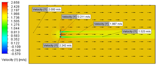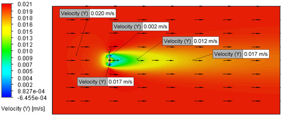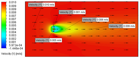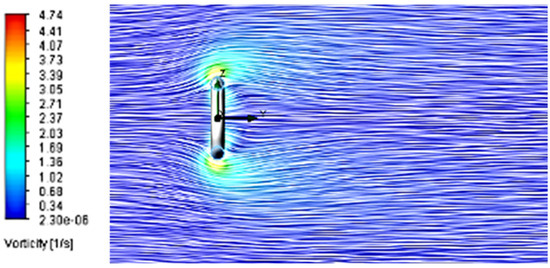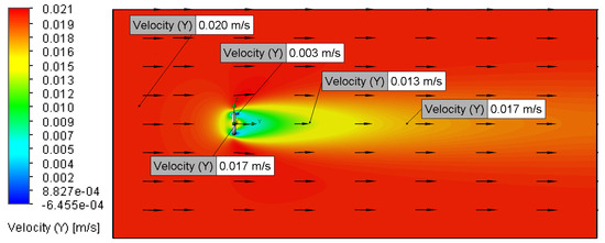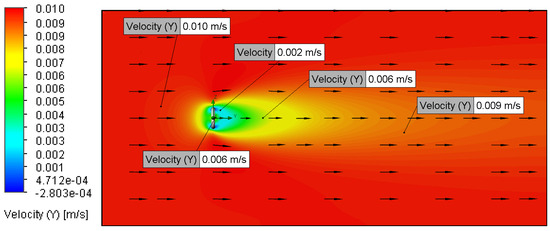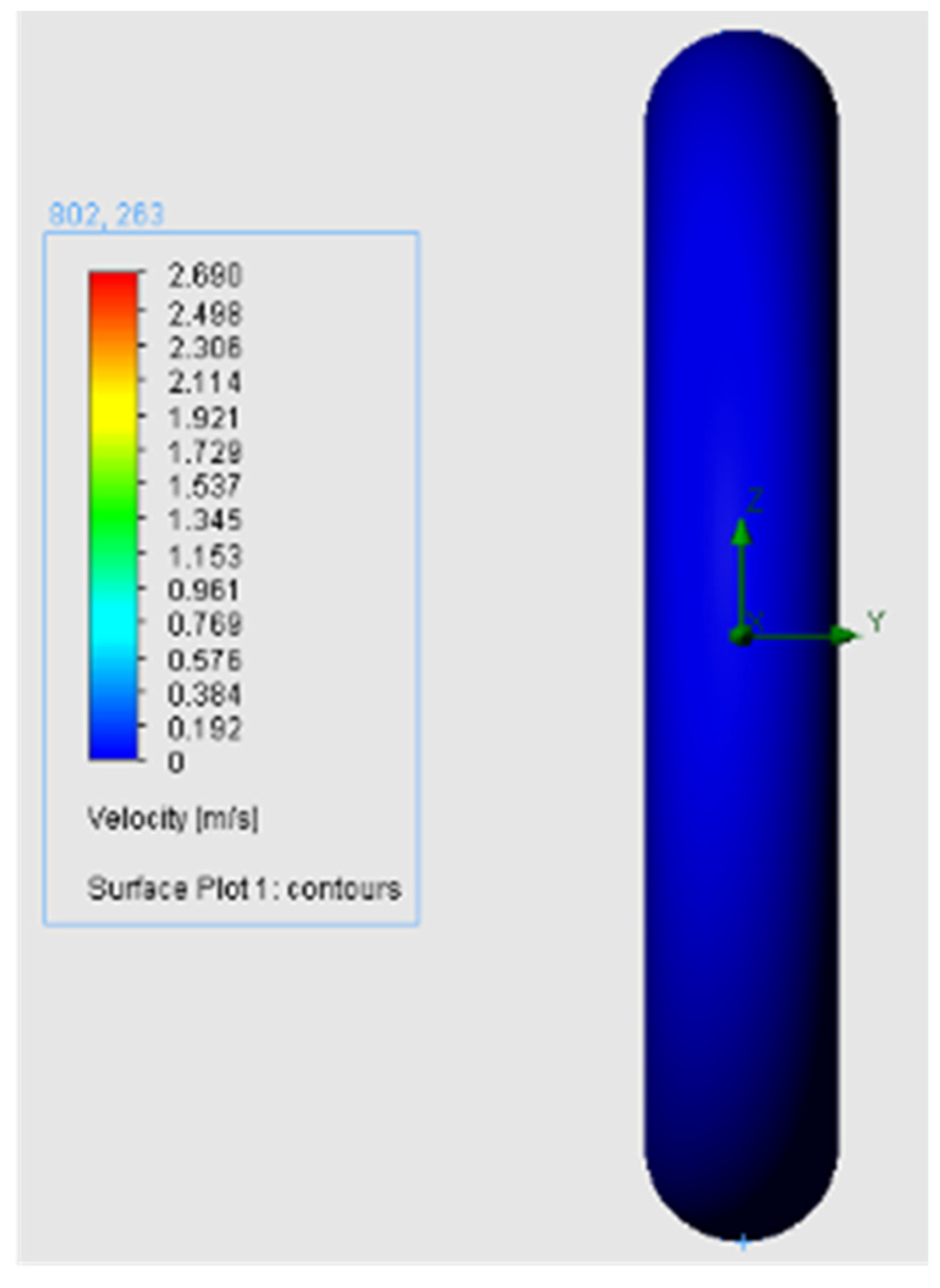 Increasing the inlet velocity from 0.01 m/s to 2 m/s resulted in a noticeable reduction in the wake region, as observed in the streamline and velocity magnitude contour plots (Figure 7, Figure 8, Figure 9, Figure 10, Figure 13, Figure 14, Figure 15, Figure 16, Figure 17, Figure 18, Figure 19, Figure 20, Figure 21, Figure 22, Figure 23, Figure 24, Figure 25, Figure 26, Figure 27 and Figure 28). This phenomenon aligns with established fluid dynamics principles [13,17,18], attributing the wake reduction to a downstream shift in the boundary layer separation points, consistent with prior discussion. However, no apparent variations in the wake structure were observed between inlet velocities of 0.01 m/s and 0.02 m/s (Figure 13, Figure 14, Figure 15, Figure 16, Figure 17, Figure 18, Figure 19, Figure 20, Figure 21, Figure 22, Figure 23, Figure 24, Figure 25, Figure 26, Figure 27 and Figure 28), likely due to the minimal difference between these low-magnitude velocities, rendering the flow behaviour effectively indistinguishable within the simulation’s resolution [13,17,18].