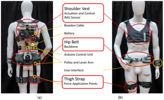 - Shoulder Vest—A shoulder vest is created using a soft and unstretchable 1000 D Cordura® nylon fabric. It has two functions: (1) to guarantee high wearing comfort and (2) to transmit the actuation strain to the torso. Regarding wearing comfort, the vest is soft and adaptable to different body shapes by adjusting the size using Velcro tapes at the shoulders and sides of the torso. Moreover, the closed-cell EVA foam material at the back helps prevent painful pressure points. To effectively transmit the actuation force to the upper body, the used fabric is stiff when tension is applied (tensile strength > 1800 N). The backbone between the shoulder vest and hip belt transmits the force from the actuator to the hip and is attached to the vest by a ball bearing, allowing free mobility of the upper torso.