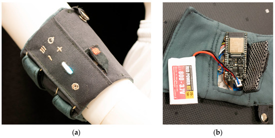 To enable the intuitive control of the exoskeleton and allow users to adjust key parameters, such as the supporting force, a wearable user interface was developed using smart textiles (Figure 3). The interface is designed as a wrist-worn device, ensuring easy accessibility while maintaining comfort and flexibility during use. The base structure consists of fabric materials, which allow the interface to be securely wrapped around the wearer’s wrist.