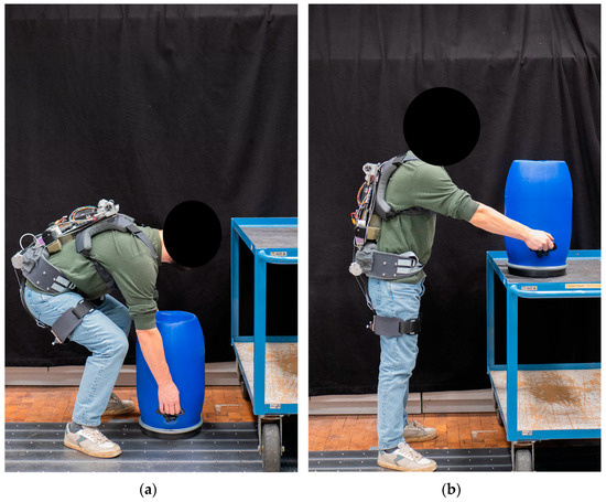 Initially, a calibration walk consisting of eight circular steps was performed to calibrate the Xsens system. Subsequently, each participant donned the exoskeleton and adjusted the fit of the hip belt and shoulder vest. The thigh straps were fastened around the thighs of the participants. After activating the system, the participants were given a five-minute familiarization period to adapt to the exoskeleton and reduce the likelihood of adopting unintended protective postures during use. During the exoskeleton condition, the system was set to provide full support at 100%. They completed a lifting task in which they lifted a 10 kg object with both hands using two handles attached to the left and right of the object from the ground and placed it on a platform in front of them at hip height (Figure 4). After lifting the load, each participant placed it back on the floor in the starting position. The task consisted of 12 repetitions, performed at a frequency of 15 lifts per minute. A metronome was used to maintain a constant speed, which provided an acoustic signal for lifting and lowering the weight. The task was repeated with and without the exoskeleton, while the trials were randomized and stopped after the first signs of pain or any abnormal functions of the exoskeleton.