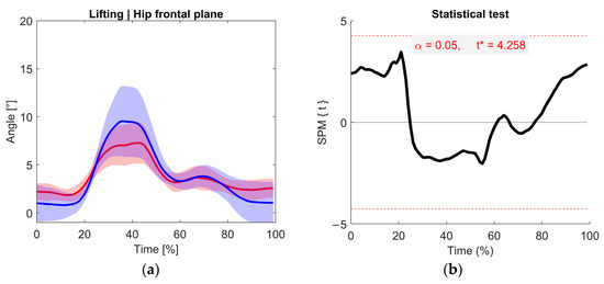 (a) Mean frontal hip angle during lifting task with (red) and without (blue) exoskeleton and (b) statistical 1D SPM test; * critical t-value.
