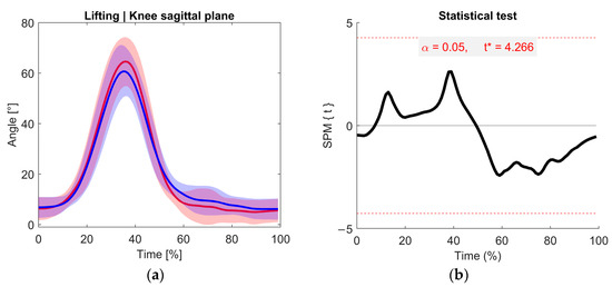 (a) Mean sagittal knee angle during lifting task with (red) and without (blue) exoskeleton and (b) statistical 1D SPM test; * critical t-value.