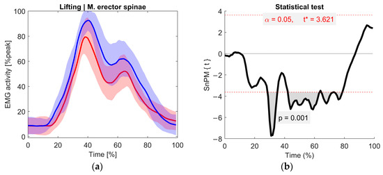 (a) Mean activity of m. erector spinae during lifting task with (red) and without (blue) exoskeleton and (b) paired-samples t-test statistic SPM {t}; * critical t-value.