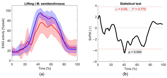 (a) Mean activity of m. semitendinosus during the lifting task with (red) and without (blue) exoskeleton and (b) paired-samples t-test statistic SPM {t}; * critical t-value.