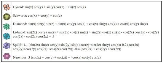 13]. For example, Gyroid, Schwartz, Diamond, Lidinoid, SplitP, Neovious, and all these TPMS have their unique equations (