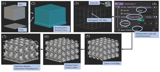 In order to model the TPMS structures, the input factors are cell types, lattice thickness, and cell size. The TPMS lattice structures are built using nTop with an overall dimension of 40 × 40 × 30 mm