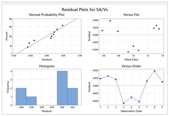 Table 5, optimal parameters were calculated in Minitab by providing 75%, 50%, and 25% response. Having SA/Vs = 0.75; ∆T = 0.25 means that maximizing SA/Vs was given 3 times more importance than minimizing ∆T and vice versa for SA/Vs = 0.25; ∆T = 0.75. For SA/Vs = 0.5; ∆T = 0.5, both objectives were given equal importance. By using this analysis, factor values are predicted that bring out the best possible multi-objective outcome of the desired balance for this study. Depending on the conditions, any of these settings—or any value between 0% and 100%—can represent the overall optimum. For instance, factors such as geometry with high manufacturing costs or fluctuations in energy prices for temperature reduction may shift the priority of these objectives, leading to a higher weight for one over the other.