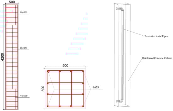 The reinforced concrete column studied in this paper was extracted from the ground-floor column of a four-story frame structure. Its design parameters strictly comply with current Chinese codes and specifications, and such configurations are widely adopted in multi-story frame structures across China, effectively representing the actual mechanical behavior of frame columns in practical engineering applications, thus possessing typical engineering representativeness. The column has a height of 4200 mm and a cross-sectional dimension of 500 mm × 500 mm. The concrete used is of grade C30, with a concrete cover thickness of 25 mm. The mechanical properties of the concrete are presented in Table 1.