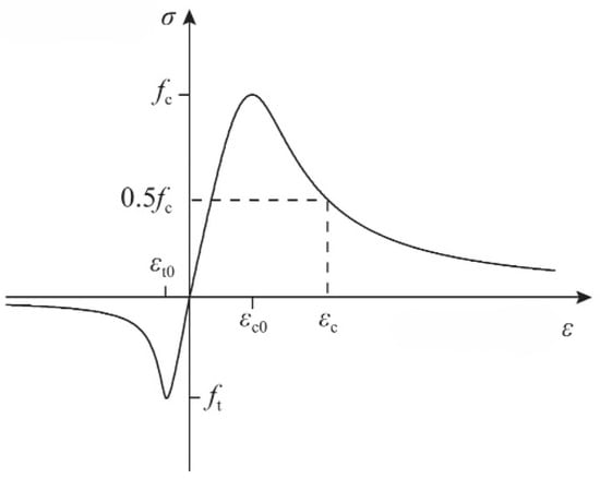 This study employs the Concrete Damaged Plasticity (CDP) model in ABAQUS for numerical simulation analysis. The CDP model reduces the elastic stiffness matrix of concrete by introducing damage factors, representing a composite constitutive model that combines plasticity theory with linear damage mechanics. The CDP model primarily considers two failure modes of concrete: crushing failure under compression and cracking failure under tension. The constitutive relationship follows the stress–strain curves for tension and compression as outlined in Appendix C of the “Code for Design of Concrete Structures” (GB50010-2010) [25], as shown in Figure 2.