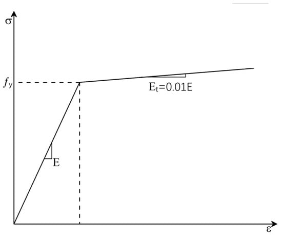 The constitutive relationship of the reinforcement is modeled using a simplified bilinear ideal elastoplastic model. The stress–strain relationship is illustrated in Figure 3. In the simulation, the elastic modulus and Poisson’s ratio of the reinforcement are determined according to reference [22].