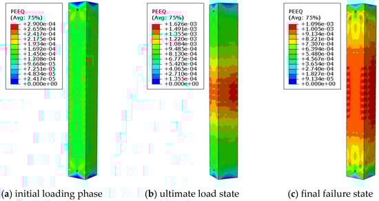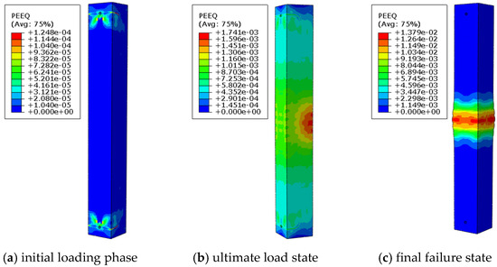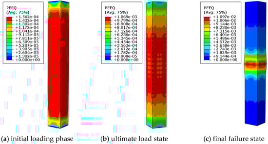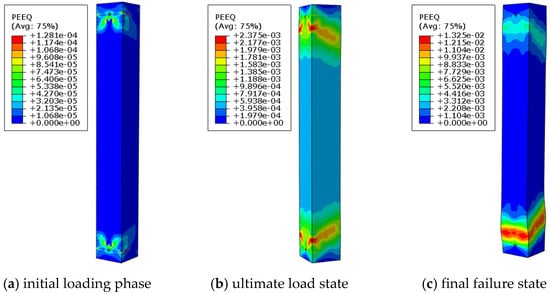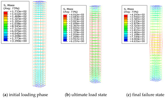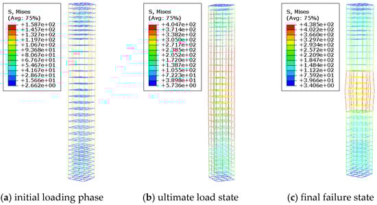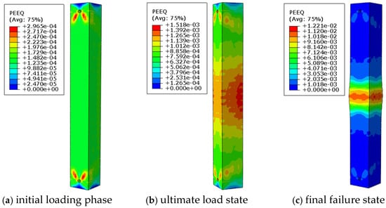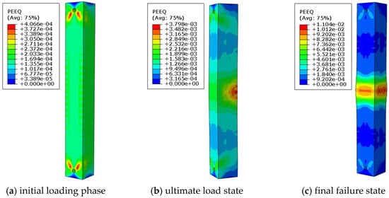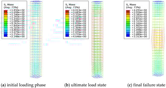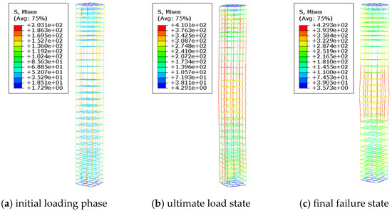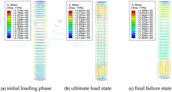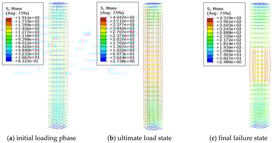 Figure 5 and Figure 6 illustrate the distribution of concrete plastic strain and the stress contours of reinforcement, respectively, for a reinforced concrete column without longitudinal pre-embedded holes during the failure process. The figures reveal typical failure characteristics under axial compression. In the initial loading stage, the specimen operates in the elastic phase, with the reinforcement and concrete working in unison to bear the load. The overall deformation is minimal, and the material strain levels are low, with no noticeable changes on the specimen’s surface. As the load continues to increase, the specimen enters the elastoplastic phase, and noticeable bulging deformation begins to appear in the mid-region. With further deformation, the local bulging becomes more pronounced, the concrete cover gradually crushes and spalls, and the longitudinal reinforcement reaches its yield strength, ultimately leading to the failure of the specimen. This failure process vividly reflects the progressive failure characteristics of reinforced concrete columns under axial compression.