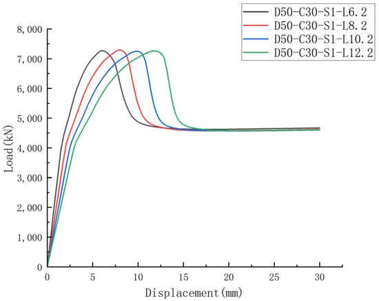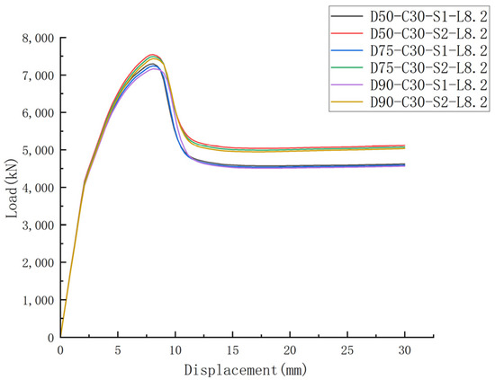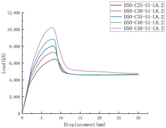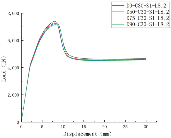 As shown in Figure 18, when the aperture of the longitudinal pre-embedded holes is smaller (50 mm), with the increase in concrete strength of the specimen, the curve slope of the elastic stage becomes larger, the stiffness of the specimen increases, and the ultimate bearing capacity of the specimen also increases with the increase in the concrete strength. Compared with the specimen D50-C30-S1-L8.2, the axial ultimate bearing capacity of specimens D50-C35-S1-L8.2, D50-C40-S1-L8.2, and D50-C50-S1-L8.2 increased by 10.16%, 21.49% and 39.83%, respectively, while that of specimen D50-C25-S1-L8.2 decreased by 11.40%. However, the ultimate displacement of the specimen column decreases with the increase in concrete strength. This is mainly due to the increase in concrete strength, alongside the increase in the elastic modulus and compressive strength of concrete, and, at the same time, the stress concentration phenomenon at the opening of the pre-embedded hole becomes more significant, resulting in the test column entering the ultimate bearing capacity state in advance, and then the ultimate displacement of the test column reaching the ultimate bearing capacity decreases.