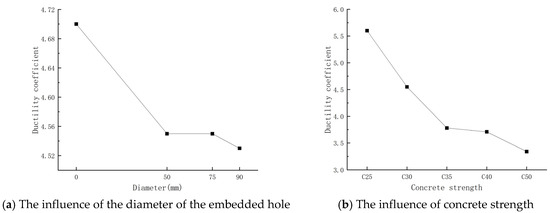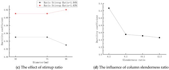 As can be seen from Figure 21, the ductility coefficient of the specimen gradually decreases with the increase in the diameter of the opening hole. Compared with the solid column, the ductility coefficient of the longitudinally pre-embedded hole reinforced concrete column decreases by 3.2~3.6%, but the decrease is small and within the allowable range of the project. The higher the concrete strength of the specimen, the more the ductility of the specimen decreases in significance. According to Figure 18, as the strength of the concrete increases, the decreasing section of the load–displacement curve becomes steeper, which indicates that the ductility is lower. This is mainly because as the strength of the concrete increases, the ultimate compressive strain of the concrete decreases, and the brittleness of the material increases, which limits the overall deformation ability of the column, resulting in a ductility decline of the specimen. With the increase in the stirrup ratio of the specimen, the ductility coefficient of the specimen also increases, mainly because the stirrup can effectively limit the transverse expansion of the concrete, delay the crushing and crack expansion of the concrete, improve the ultimate compressive strain of the concrete, and effectively improve the stress distribution in the area of the embedded hole, reduce the stress concentration around the hole, and delay the development of cracks. However, when the slenderness ratio of the column increases, the ductility coefficient of the specimen shows a downward trend, which is mainly because the increase in the slenderness ratio reduces the stability of the column and leaves it more prone to instability failure, thus weakening the overall deformation ability. In addition, the second-order effect of the column will be increased, further accelerating the stiffness degradation and failure of the specimen column, resulting in the decline of the ductility of the column.