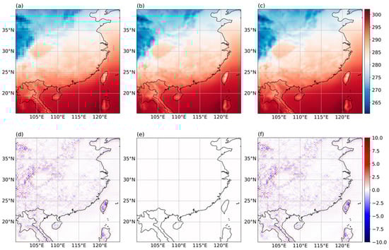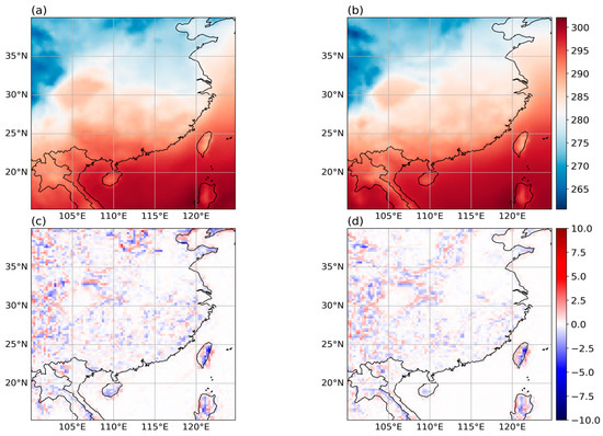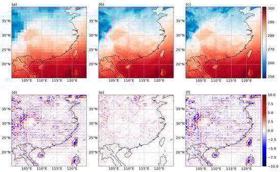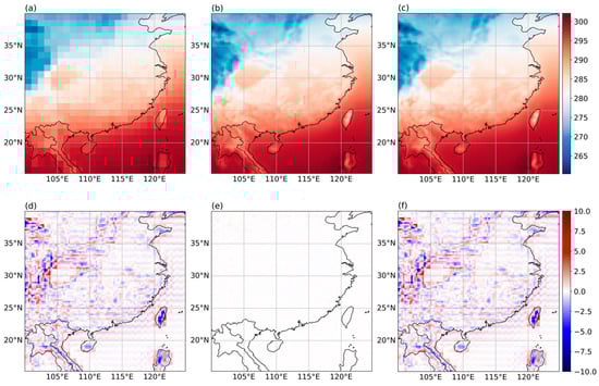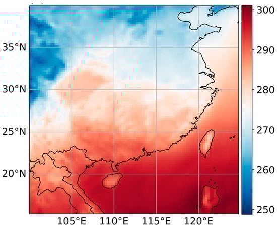 In the experiment, we conducted downsampling on the original dataset to generate LR data, which was utilized as the input for the model. The temperature data spanning from 1 January 2023 to 31 December 2023 were designated as the training set, while the dataset covering 1 January 2020 to 31 December 2020 was used as the validation set. The region is characterized by a subtropical monsoon climate, with high temperatures typically occurring from June to August and low temperatures prevailing from December to February of the following year. The 2 m temperature data used in the experiment indicate an average annual temperature of ; July is the hottest month, averaging , and January is the coldest month, averaging . The dataset features a temporal interval of 1 h and consists of a total of 17,520 data samples. To ensure that the downsampling maintains spatial alignment between the LR data and the original data for subsequent model training, we employed specific downsampling window sizes (2 × 2 or 4 × 4 pixels) to calculate the value of the data points within each window. During the downsampling process, boundary data points that do not form a complete window were excluded. This method aims to retain key information from the original dataset while reducing its resolution to facilitate model training and analysis. Our ultimate goal is for the model to generate super-resolution reconstruction data for the region spanning latitudes from 16.25° N to 40° N and longitudes 100° E to 123.75° E, utilizing LR data of varying sizes. The outcomes are illustrated in Figure 2.