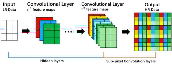 where represents the original data, and denotes the HR data output by the model. refers to the shuffling operation, which is the model’s process of padding the feature values. Specifically, in sub-pixel convolution, LR pixels are regarded as an area of size . During upsampling, the model utilizes the features it has learned to fill this area, adjusting the output of the final convolutional layer to
