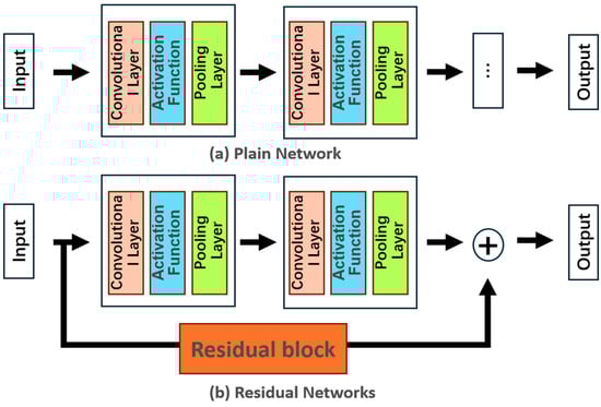 where denotes a residual block. Traditional CNNs have attempted to model the nonlinear mapping between the input data and the corresponding output through the stacking of multiple convolutional layers. During the actual training process, this identity mapping is challenging to learn, and the pursuit of this mapping through an excessive number of convolutional layers often leads to the network degradation problem. ResNet does not directly learn this mapping but instead focuses on the difference between the input and output, achieving an identity mapping through alternative structural means []. In ResNet, the problem is reformulated as , where the identity mapping is explicitly integrated into the network architecture. This transformation shifts the focus to learning the residual , which simplifies the optimization process and enhances the network’s ability to model complex functions []. This approach makes it easier to find the mapping function compared to traditional CNNs. Moreover, it achieves the same effect with a model that is less deep and less complex, as shown in Figure 5b.