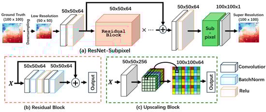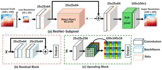 (a) ResNet-Subpixel (2×) structure and experimental flow, containing some residual Bblocks. (b) Residual block containing 2 convolutional layers, 2 BatchNorm layers, and an activation function Relu. (c) Upscaling Block.