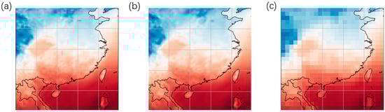 Example temperature fields (shaded color) from the original dataset at 0.25° × 0.25° (a); low-resolution dataset at 0.5° × 0.5° (b); and low-resolution dataset at 1° × 1° (c).