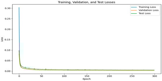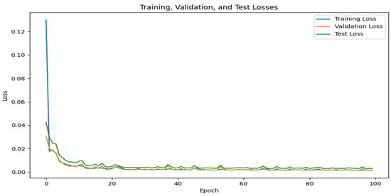 We performed an experiment on LR data (0.5° × 0.5°) generated through downsampling of original data by a factor of 2. As illustrated in Figure 6, our deep learning model processes 50 × 50 inputs to generate outputs at 100 × 100 resolution, effectively achieving a 2× super-resolution reconstruction. As shown in Figure 8, the model converged after approximately 70 epochs of training at a resolution of 0.5° × 0.5°, with the loss dropping to a low and stable state. Figure 9 and Figure 10 display the SR reconstruction of 2 m temperature data for a single moment (31 December 2020—23:00) and the average for the entire year of 2020 in the validation dataset, respectively. In the first instance, we can observe the specifics of LR data, SR data, and true data. The second column presents the differences among the three types of temperature data. Through these differences, we can directly observe and analyze the discrepancies between each observation point (pixel) in the region, including whether there are severe deviations in different areas and the direction of these deviations.