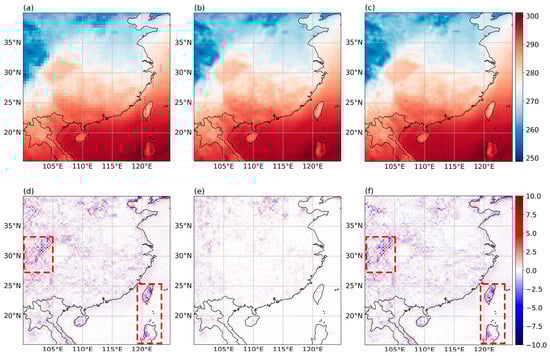 SR results for a single moment at a resolution of 0.5° × 0.5°: (a) LR temperature data; (b) SR temperature data; (c) true surface temperature data; (d) comparison between true data and LR data; (e) comparison between true data and SR data; (f) comparison between SR data and LR data. The areas where the LR data differs greatly from the SR data and the real data are indicated by the red dotted line.