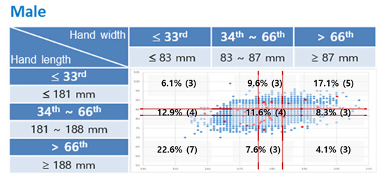Seventy Koreans (35 males, 35 females; 20 left-handed, 50 right-handed) in their 20s to 60s (mean ± SD = 38.0 ± 16.2; range = 20~63 years) with varying hand lengths, hand widths, and smartphone UI experience participated in the smartphone grip posture experiment. The participants (mean hand length = 180.6 ± 11.1 mm; mean hand width = 81.2 ± 6.7 mm) were recruited based on the distribution of hand length and hand width from Korean anthropometric data [45]. As shown in Figure 1, participants were divided into nine groups according to hand length and hand width for each gender: for males, the 33rd percentile hand length is 181 mm and the 66th percentile is 188 mm, with hand widths at the 33rd percentile being 83 mm and the 66th percentile being 87 mm; for females, the 33rd percentile hand length is 166 mm and the 66th percentile is 173 mm, with hand widths at the 33rd percentile being 74 mm and the 66th percentile being 78 mm. The dominant hand of each participant was determined using the Edinburgh Handedness Inventory [46]. The hand dominance assessment involved 10 tasks (e.g., writing, drawing, using a spoon), each rated on a 5-point scale (1: always left hand, 2: usually left hand, 3: both equally, 4: usually right hand, 5: always right hand). Additionally, participants were required to have no history of visual or musculoskeletal disorders that might interfere with normal smartphone use and to have at least three years of experience using smartphones. The present study was approved by the Institutional Review Board (IRB) of the Pohang University of Science and Technology (PIRB-2018-E100).