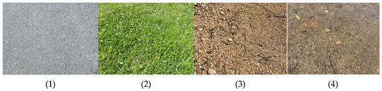 Different operating terrains. From left to right: (1) bituminous material, (2) grass, (3) gravel, and (4) mud.