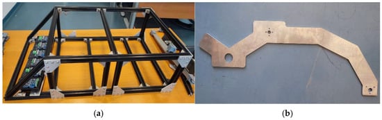 The central structure of the platform, which houses the propulsion and control systems, was built from modular aluminium profiles with a section of 20 mm × 20 mm, as Figure 3a shows. The moving parts were machined using a 6-millimeter-thick 5754 H111 aluminium sheet as the raw material (see Figure 3b).