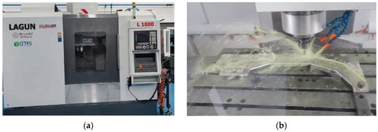 The equipment used for machining was a 3-axis machine-type computer numerical control (CNC) (Lagun Machinery S.L, Alava, Spain), model Lagun 1000, with a Fagor 8050 processor (see Figure 4). The parts that serve as housing for the bearings and shafts ((4) in Figure 2) connecting the moving parts of the chassis with the fixed parts (central casing) were also machined from 5754 H111 aluminium, due to the high stresses they must withstand without deforming.