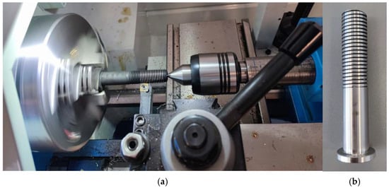 (a) Detail of the turning of an M16 stainless steel screw on a manual lathe. (b) The final result.