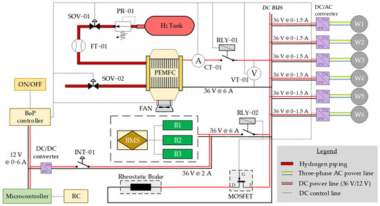 Both the PEM fuel cell and battery pack are connected directly to the DC bus with relays RLY-01 and RLY-02. This configuration avoids the use of heavy power electronics, mitigating excess weight on the mobile platform.