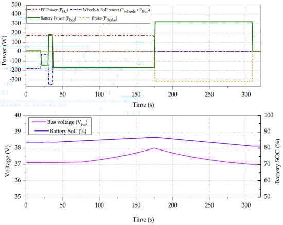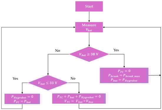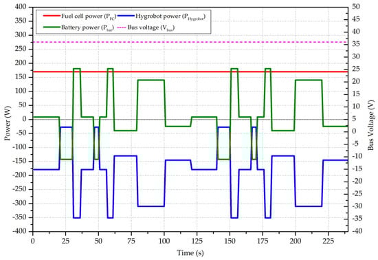 Regarding the power balance, which is based on the direct connection of the PEM fuel cell subsystem and the battery subsystem with the DC bus, a passive power management system is implemented. The nominal battery subsystem voltage and PEM fuel cell subsystem can be expressed as = = 36 V. The battery voltage is monitored. In this case, its value is ; this means that the battery subsystem is overcharged. Then, the PEM fuel cell is disconnected, the rheostatic brakes are activated, and the battery subsystem provides the power demanded by Hygrobot. This will involve the battery subsystem discharges. In the case of , this means that the battery subsystem is over-discharged. Then, Hygrobot is stopped, and the PEM fuel cell recharges the battery subsystem. When , the PEM fuel cell and battery subsystems supply the power demanded by Hygrobot, Figure 7.