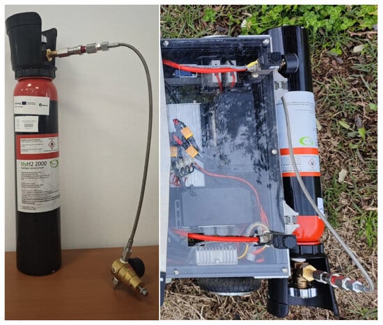 Detail of the hydrogen tank MyH2-2000: (left) in the laboratory; (right) outdoors, on the Hygrobot platform.