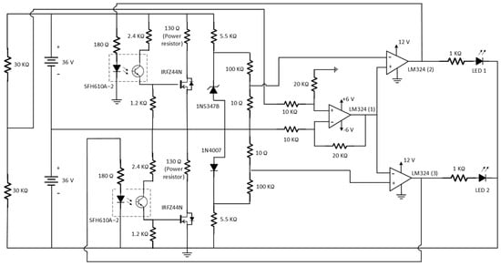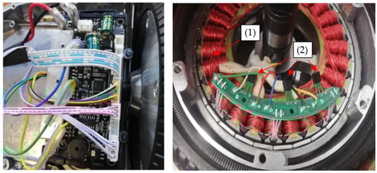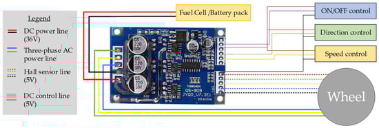 The electrical power system was designed according to load requirements and primarily consists of six AC-powered wheels. DC/AC converters (Shenzhen Renhao Weiye Technology Electronics Co., Ltd., Donnguan, China) are used, operating at 36 VDC/wheel, with a current consumption ranging from 0 to 1.5 A/wheel (Figure 6).