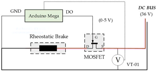 Finally, a rheostatic braking system has been included on the platform, with the aim of dissipating the energy surplus that could eventually appear when the PEM fuel cell and battery subsystem are working together. The rheostatic brake is connected to the DC bus by means of a MOSFET transistor, controlled by the microcontroller, which can activate or deactivate the transistor, depending on the bus voltage.