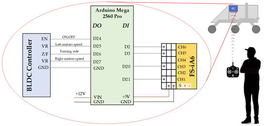 The platform’s driving system is based on a 6-channel radio-controlled (RC) module (described in Section 4) that allows the user to move the vehicle in different directions and speeds. The radio control module communicates with the power converters of the wheels through the signal modulation carried out by the microcontroller.