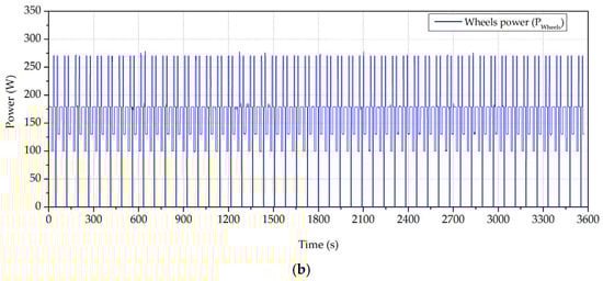 The average power consumed by the wheel is calculated by considering half of the maximum current required by the wheel (maximum current 1.5 A/wheel) at 36 V, where = 0.75 A·36 V = 27 W. The BoP power consumption is obtained from = 0.5 A·36 V = 18 W, while for the rheostatic brake, an activation time of 2% of the platform duty cycle is assumed, resulting in = 6.4 W. This gives a result of = 186.4 W and = 16.4 W.